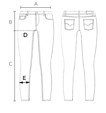| Größe | Bundweite (A) | Schrittlänge (B) | Beinlänge (C) | Oberschenkelweite (D) | Wadenweite (E) |