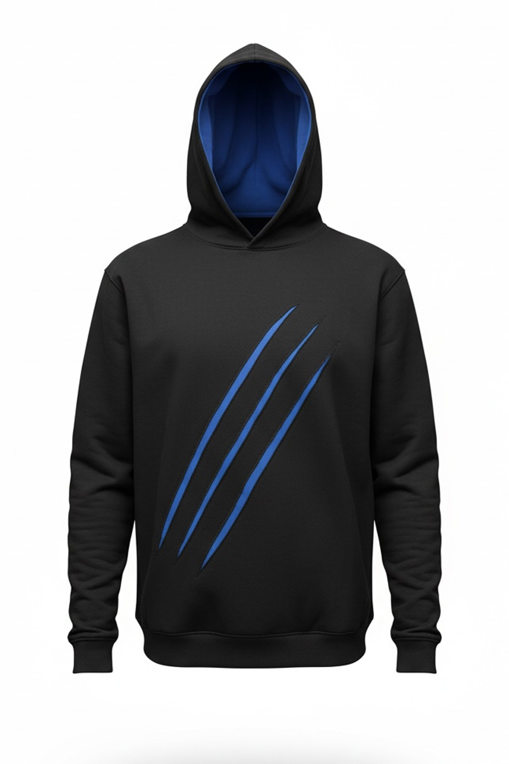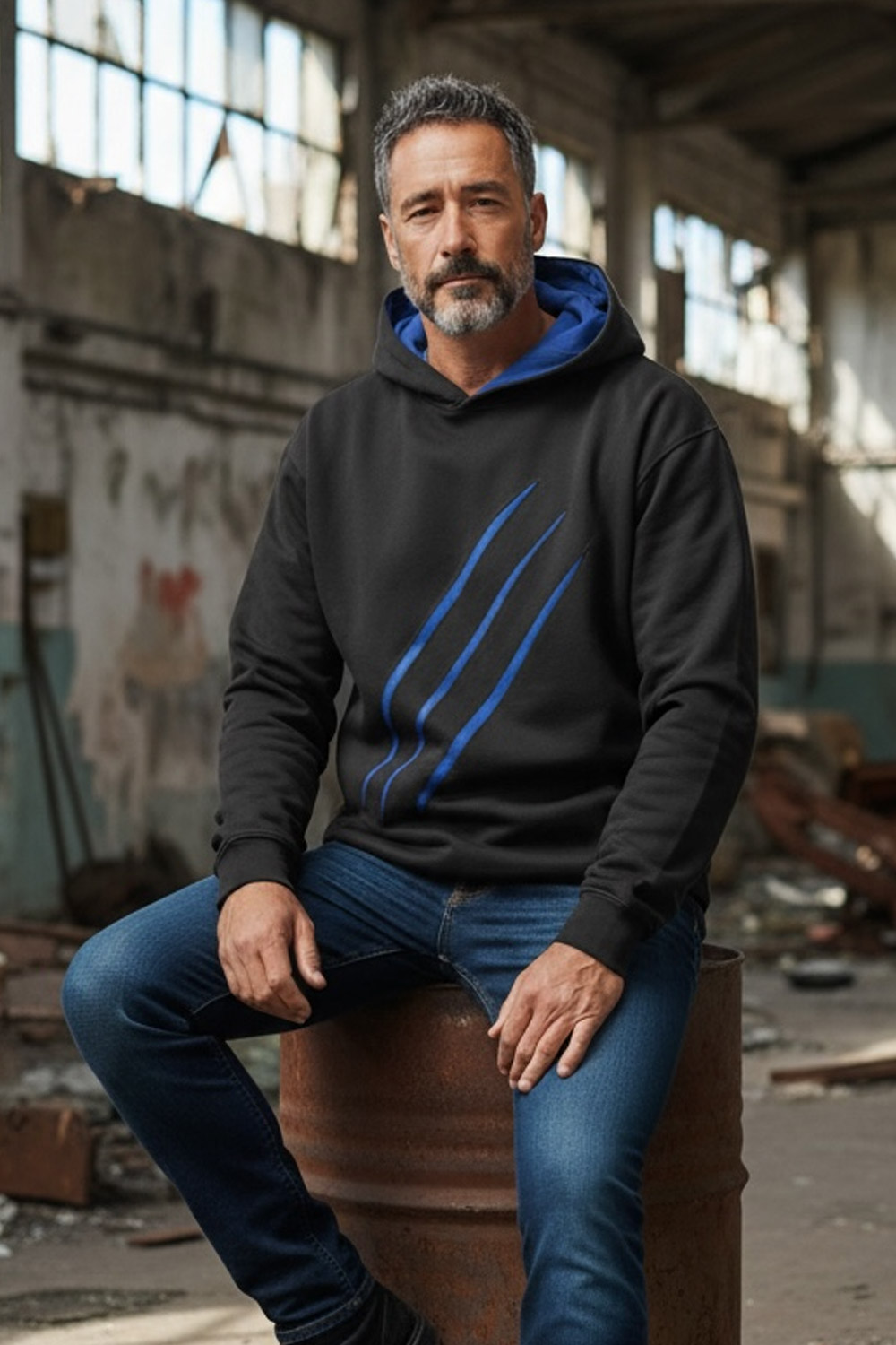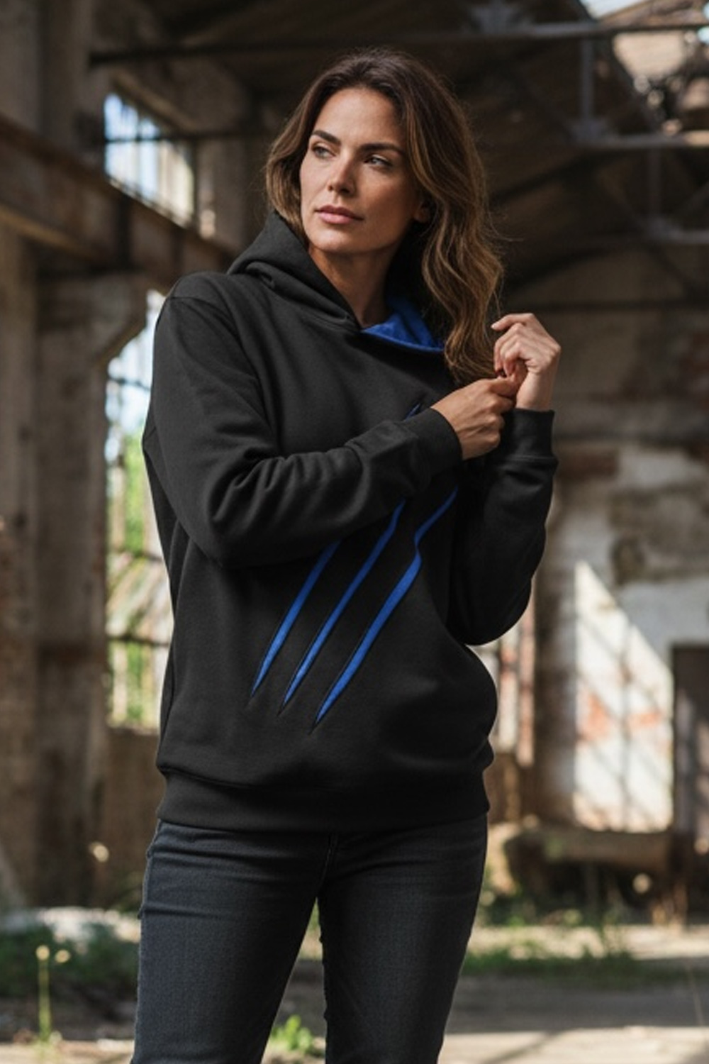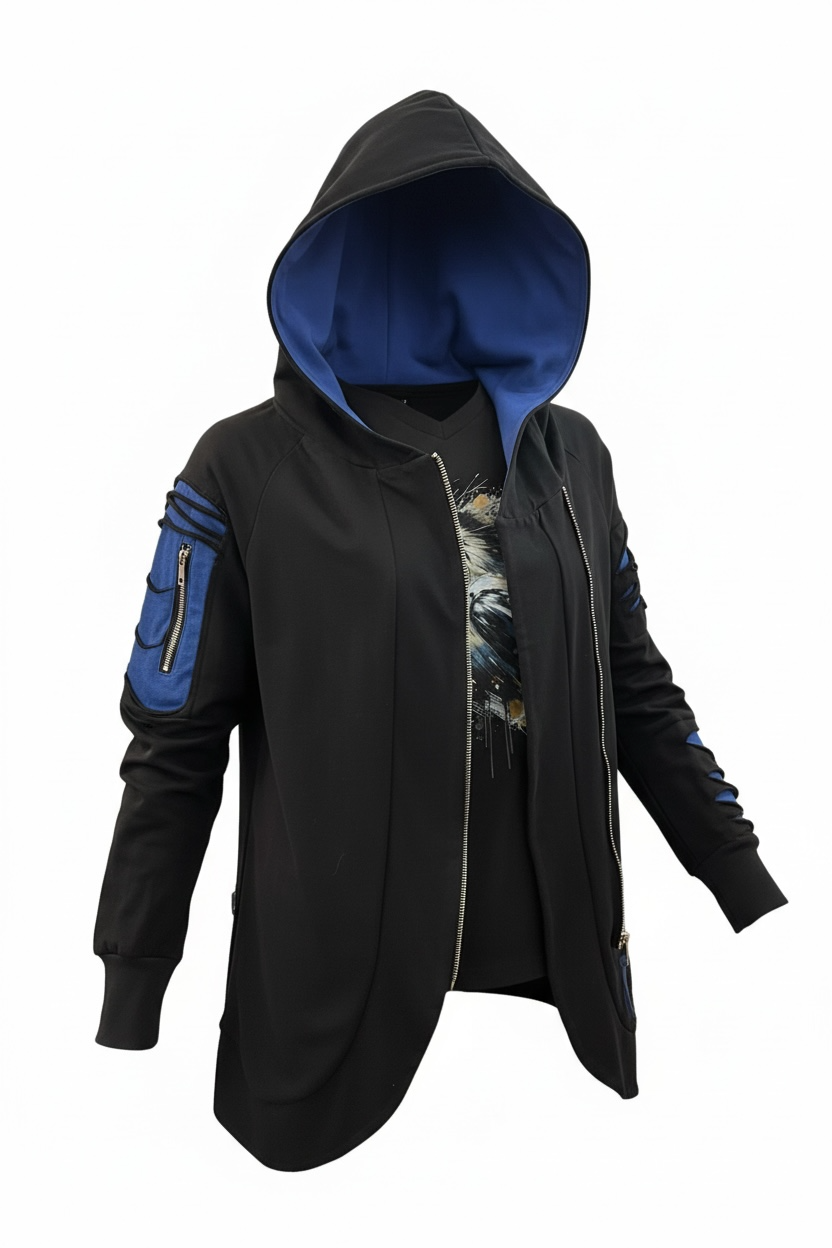 Unsere selbst entwickelte Sweat-Jacke setzt klare Akzente: außen tiefschwarz, mit einer markant abgesetzten Innenkapuze in royalblau. Echtlederdetails aus blauem Rindsleder bringen das Design besonders an den Ärmeln stark zur Geltung.