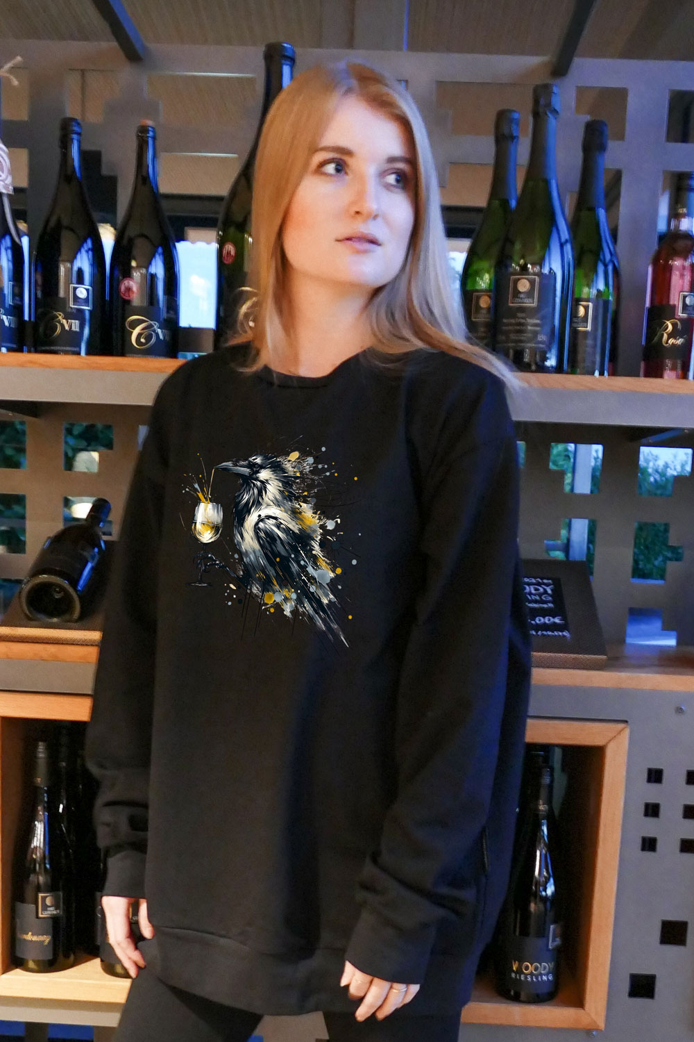 Bist du bereit, alle Blicke auf dich zu ziehen? Unsere schwarze Krähe in Gold, Silber und Schwarz ist mehr als nur ein Design – sie ist der Blickfang, der dir den Weg zeigt. Mit einem edlen Weinglas in der Hand und ihrem kraftvollen Splash-Muster zieht sie alle in ihren Bann. Egal, ob du den Pullover schick oder sportlich trägst – die Krähe bleibt immer ein Statement. Sie symbolisiert Freiheit, Stärke und den Mut, du selbst zu sein. Ein absolutes Highlight – handgenäht in unserer eigenen Produktion in Eltville. Entwickelt aus Leidenschaft, designt für dich. Du bist der Wegweiser, du bestimmst die Richtung !