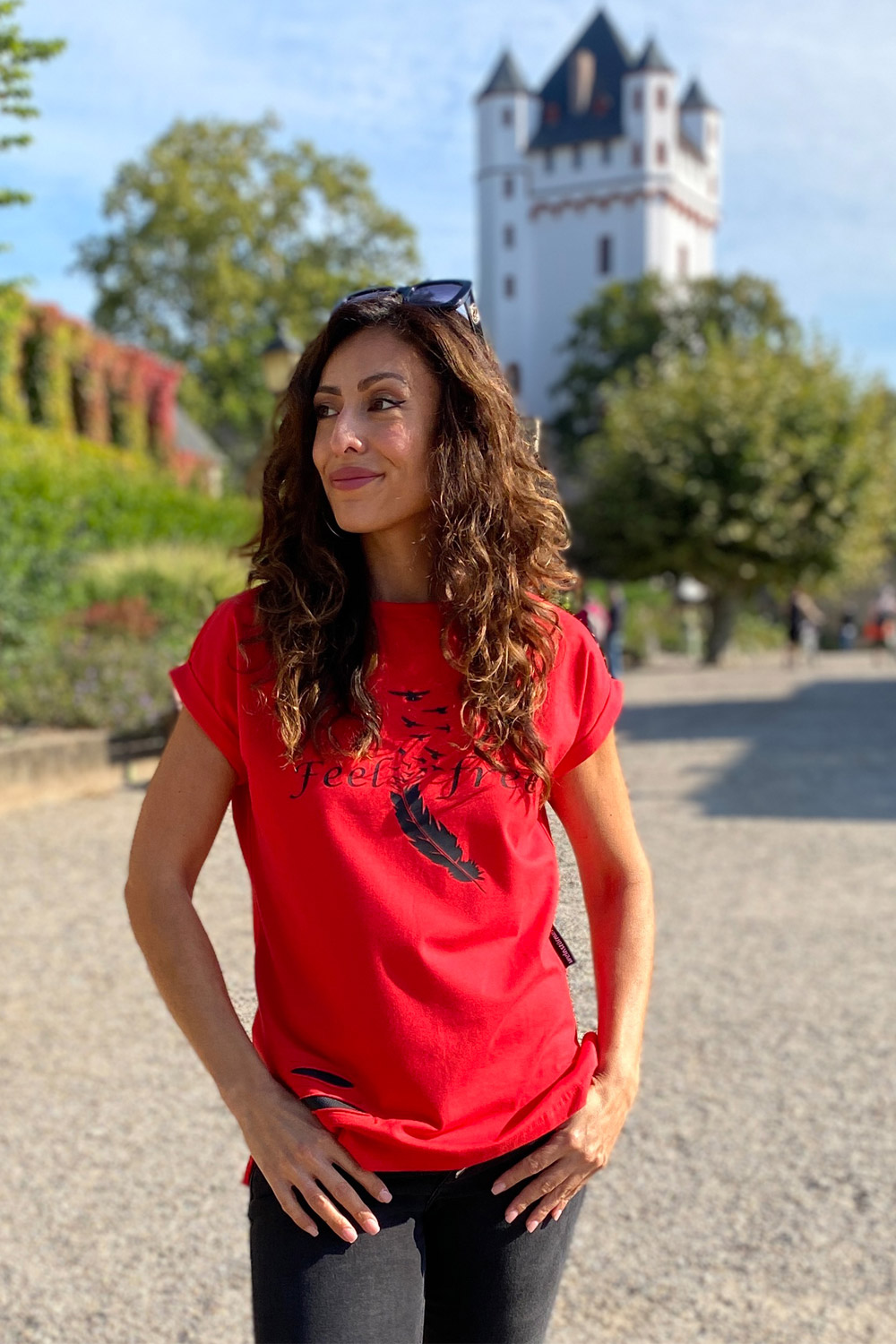 Erlebe das Gefühl von Freiheit mit unserem einzigartigen roten Oberteil. Die kraftvolle rote Farbe strahlt Energie und Leidenschaft aus, während das schwarze Leder-Detail einen Hauch von Luxus und Eleganz hinzufügt. Der "Feel Free" Schriftzug erinnert Dich daran, jeden Moment zu genießen und Deine Freiheit auszuleben. Dieses T-Shirt steht für den Ausdruck Deiner Persönlichkeit und ihres unbändigen Willens, das Leben in vollen Zügen zu genießen. Spüre die Qualität, den Komfort und die Freiheit, das dieses T-Shirt Dir schenkt - Tag für Tag. Material und Herkunft95% Baumwolle, 5% Elasthan, rot, schwere Qualität, Echtleder Cut-Outs in schwarz, Ärmelaufschlag, hochwertiger Transferdruck, feine Webetiketten, 100% entwickelt und hergestellt in Eltville am Rhein MaßtabelleGrößeWeite (A)Länge (B)S46,5cm69,5cmM50cm70cmL54,5cm71,5cmDie Länge (B) wird am Rücken gemessen.