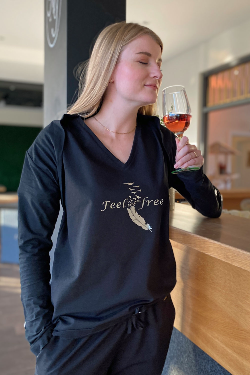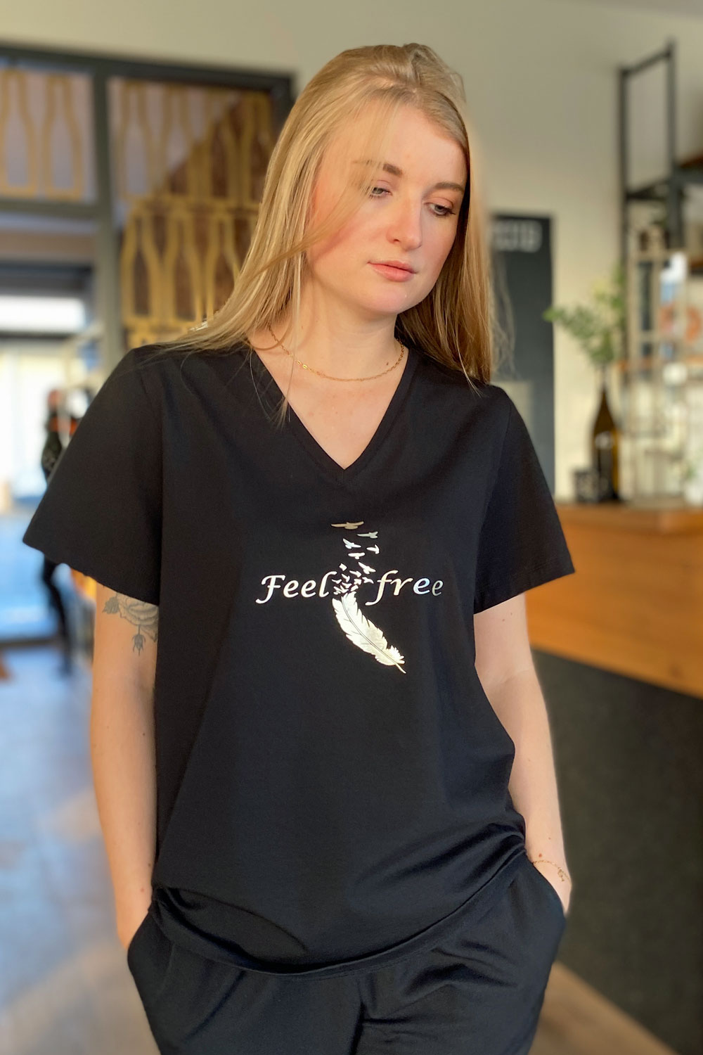Feel Free ist mehr als ein T-Shirt – es ist ein Lebensgefühl. Das tiefe Schwarz trifft auf silbermetallic glänzenden Print, der im Licht aufblitzt wie ein kleiner Befreiungsschlag im Alltag. Die schwebende Feder mit dem Schriftzug „Feel free“ erinnert daran, Ballast loszulassen und den eigenen Weg zu gehen – ohne Kompromisse, ohne Massenware, dafür mit klarer Haltung. Jedes Shirt wird in kleiner Auflage im Atelier in Eltville angefertigt: hochwertige Stoffe aus Europa, sorgfältig verarbeitet, fair produziert – für alle, die Freiheit nicht nur denken, sondern tragen wollen. Ob zum Blazer, zur Lieblingsjeans oder zu Sneakern – der silberne Metallic-Print gibt jedem Outfit dieses eine, laute „Ich mach mein Ding“.