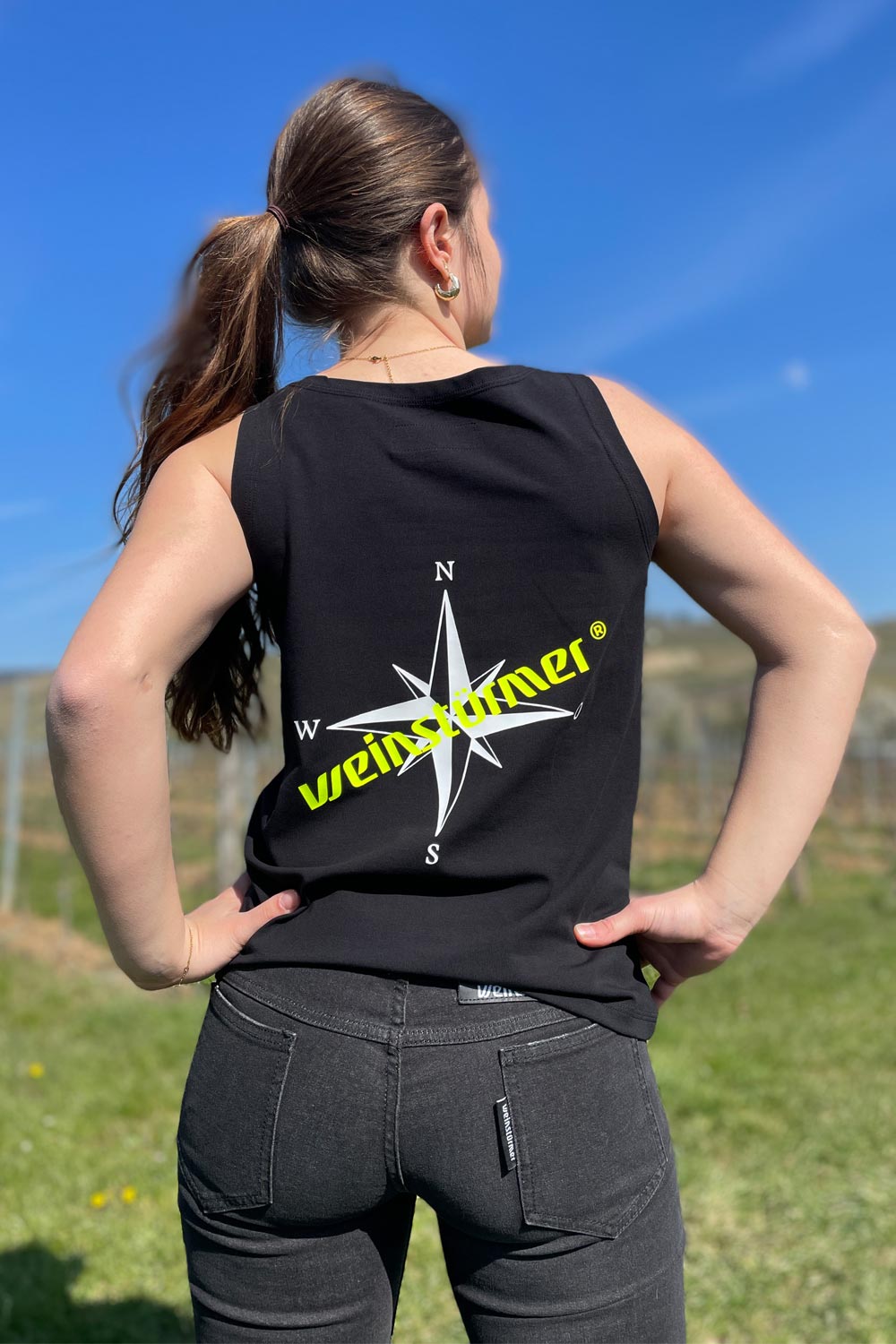 Hinten: der Kompass mit durchgezogenem WEINSTÜRMER-Schriftzug – für alle, die wissen, wo’s langgeht.
