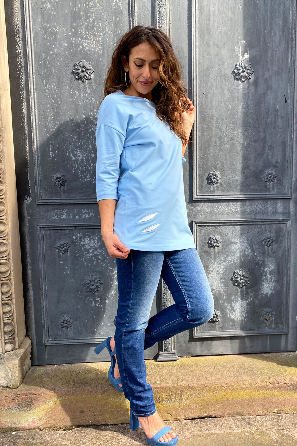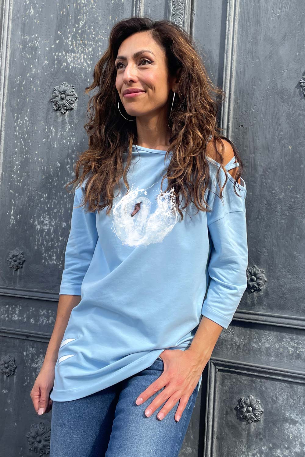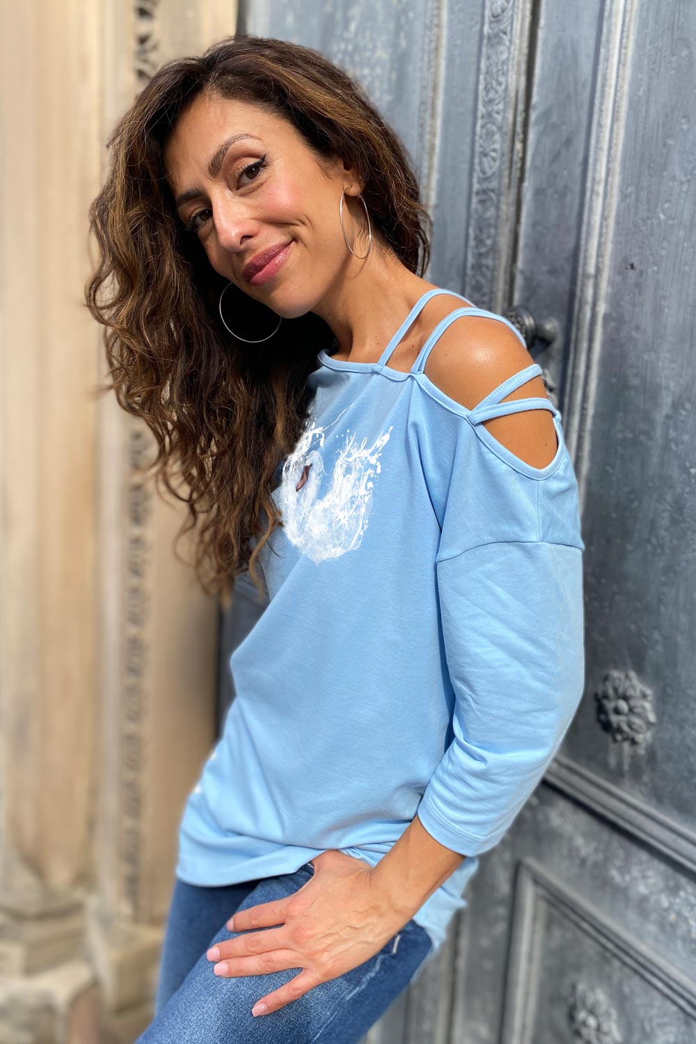 Das modische Oberteil ‚Chardonnay bleu‘ besticht durch seine raffinierte Eleganz und einzigartigen Details. Die halben Ärmel, die bis zum Ellenbogen reichen, verleihen dem Design eine klassische Note. Auf einer Seite sorgen feine Bänder für einen raffinierten Look, indem sie den oberen Arm dezent freilegen. Die Echtleder-Cut-Outs setzen stilvolle Akzente und machen das ‚Chardonnay‘-Oberteil zu einem besonderen Highlight in jeder Garderobe. Zusätzlich ziert ein prachtvoller Schwan in Splash-Optik dieses einzigartige Stück. Perfekt für modebewusste Frauen, die Wert auf hohe Qualität und außergewöhnliches Design legen.