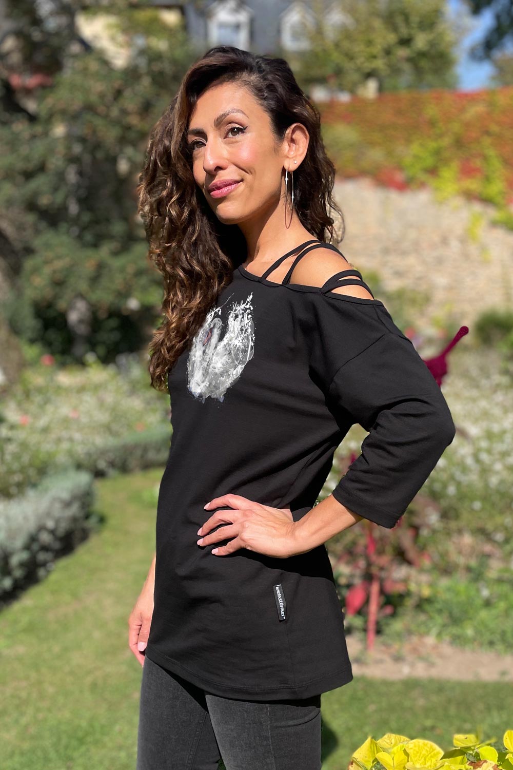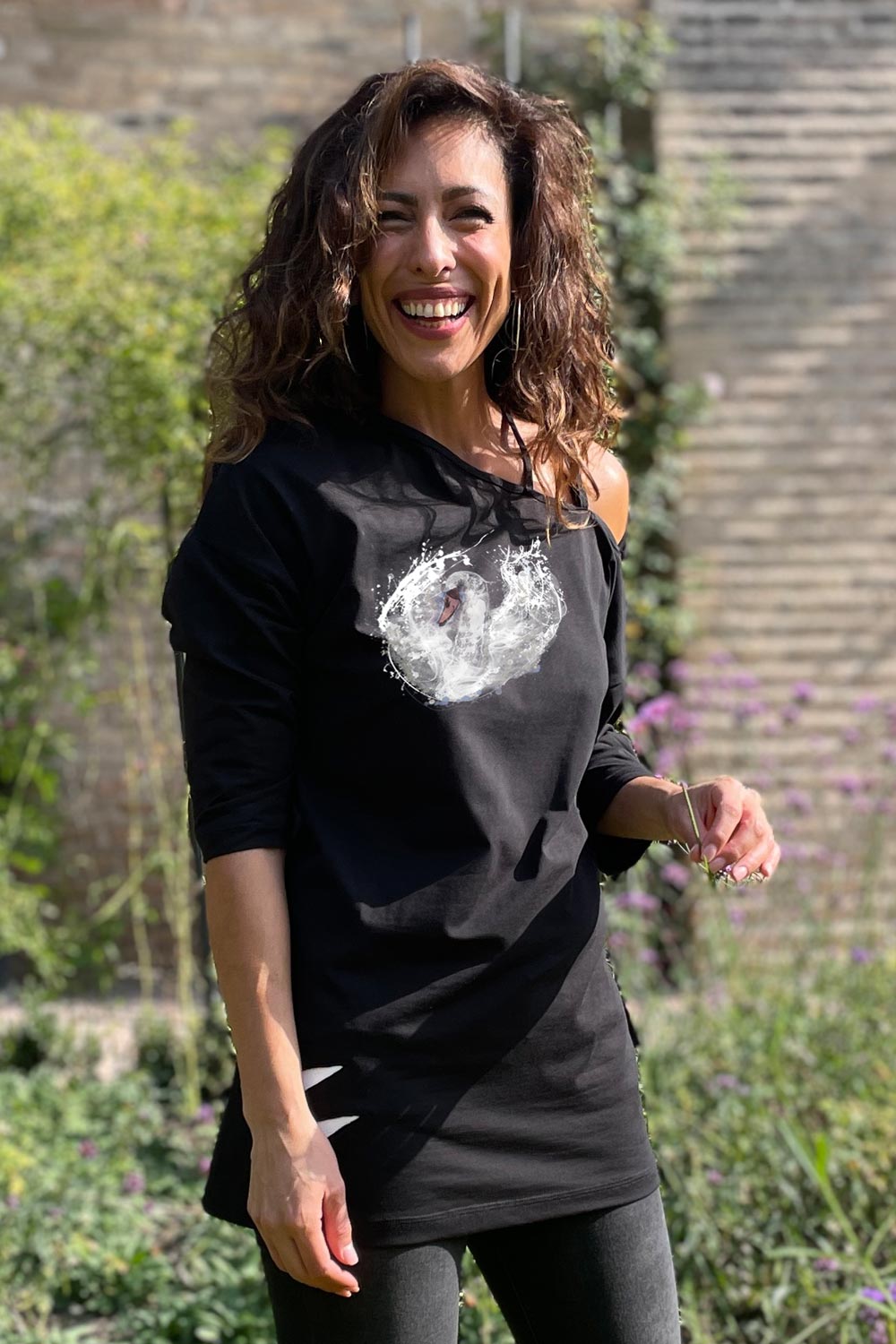 95% Baumwolle, 5% Elasthan, schwarz, weit geschnitten, Echtleder Cut-Outs in weiß, Schwan Motiv in Splash Optik, feines Flaglabel, 100% entwickelt und hergestellt in Eltville am Rhein