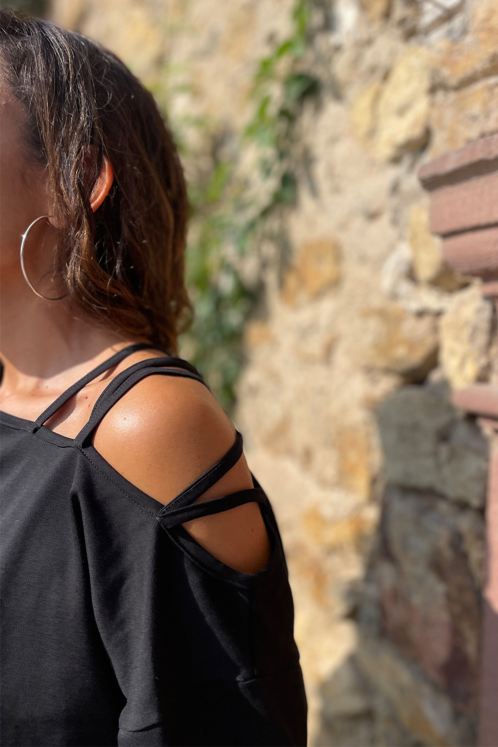 Das modische Oberteil "Chardonnay noir" besticht durch seine raffinierte Eleganz und einzigartigen Details. Die halben Ärmel, die bis zum Ellenbogen reichen, verleihen dem Design eine klassische Note. Auf einer Seite sorgen feine Bänder für einen raffinierten Look, indem sie den oberen Arm dezent freilegen. Die Echtleder-Cut-Outs setzen stilvolle Akzente und machen das "Chardonnay-Oberteil" zu einem besonderen Highlight in jeder Garderobe.