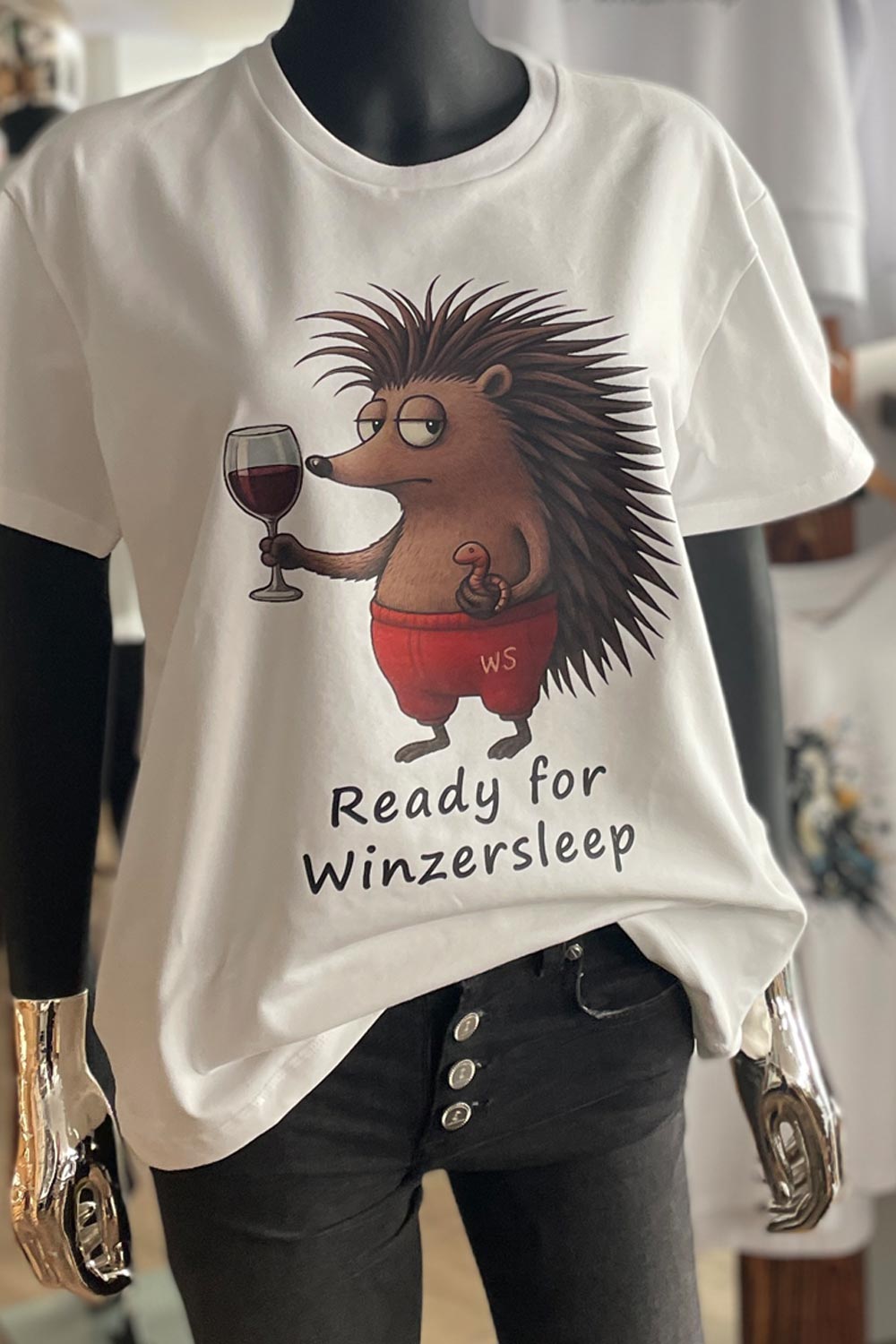 Der weinstürmer-Igel weiß, wann es Zeit ist, loszulassen – mit einem Glas Rotwein in der Hand, dem Wurm als treuen Begleiter und dem Kürzel WS auf der Shorts: weinstürmer. Winzersleep.